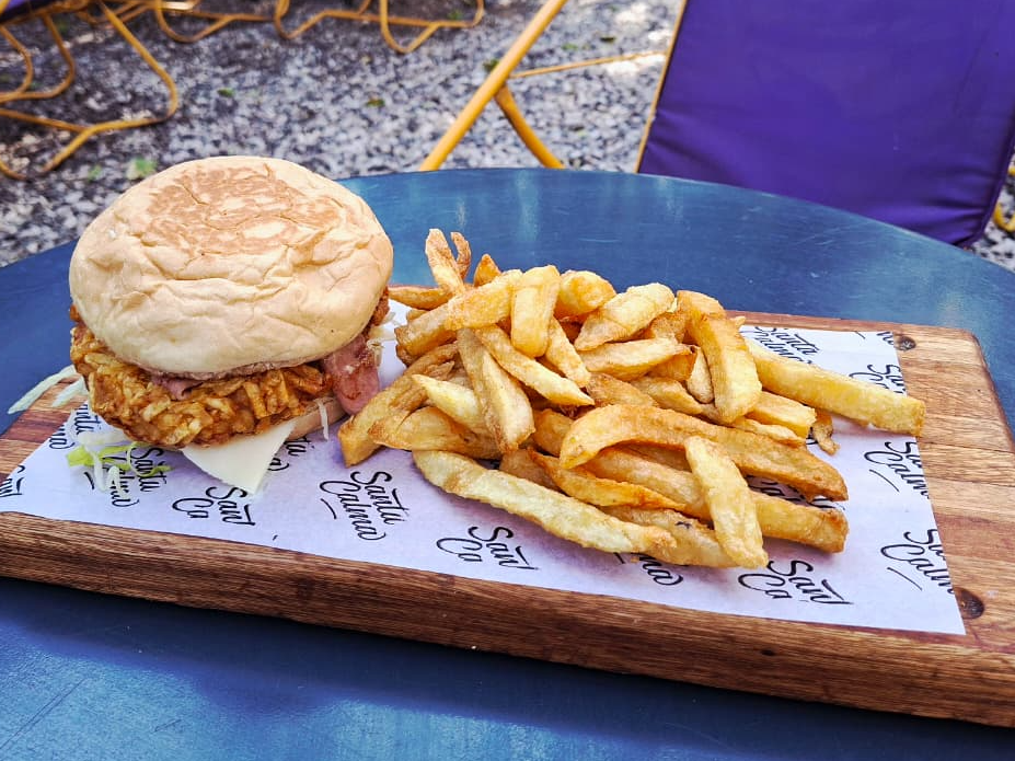 Hamburguesa Rey Cesar Compartir Pan de papa, aderezo cesar, escamas de queso parmesano, medallón crispy de pollo y panceta, acompañada de papas fritas.$17.330 Observaciones 0 / 150